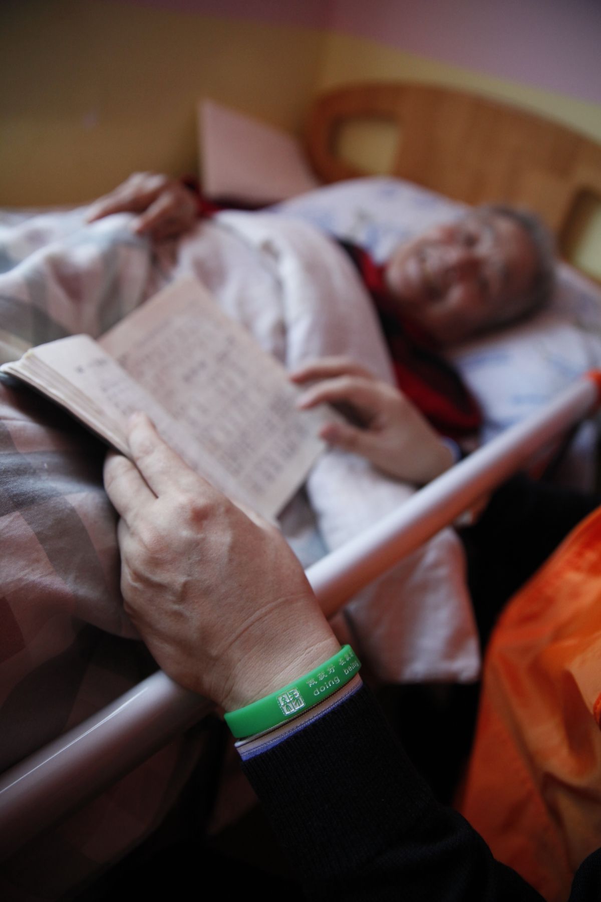 十方缘志愿者为卧床的老人读书。摄影/张旭