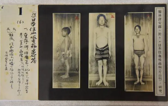 日本儿童血吸虫病患者,右一为重症,左、中为轻症